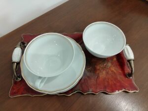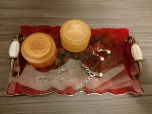 Podkładka z żywicy epoksydowej.Kolor,perłowa czerwień ze złotą mozaiką.Rozmiar 30x18cm.    Teraz wszystko w jednym i widocznym miejscu.Sprzedaż  dotyczy tylko tacy,pozostałe akcesoria to  element dekoracji.