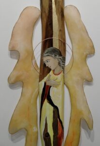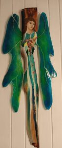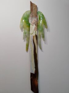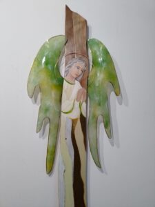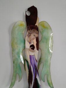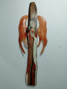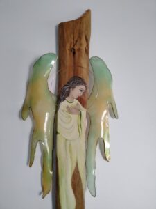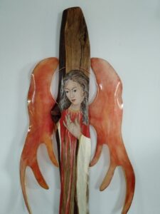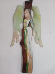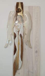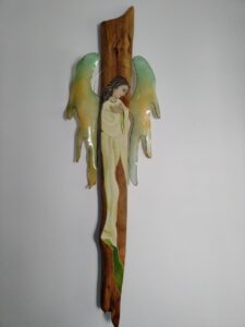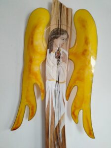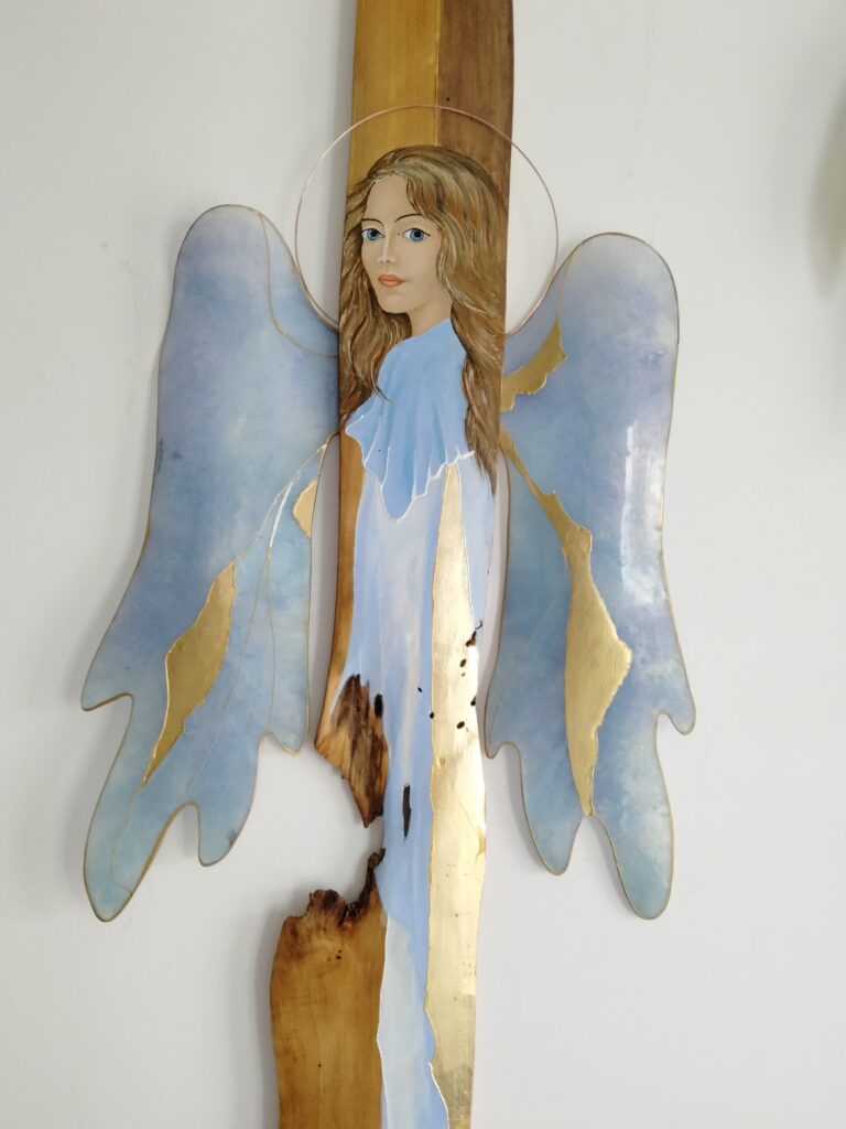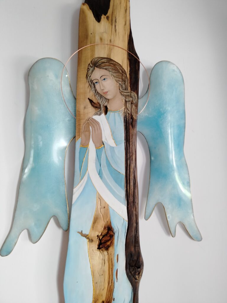 Wizerunek Anioła jest wykonany akrylem, na deskach z historią. Skrzydła, to żywica epoksydowa, wzmocniona matą szklaną, ręcznie formowana, sprawia wrażenie szkła.