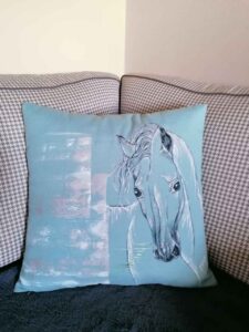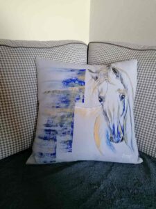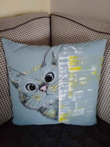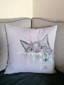 Tkanina malowana farbą do tkanin na bazie wody. Prać w wodzie o temperaturze do 40 stopni C. Prasować na lewej stronie.