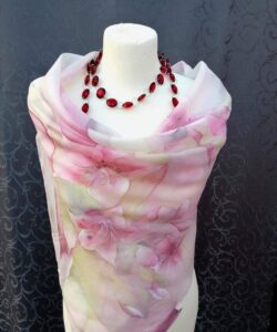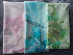 Pranie jedwabiu jest proste, jeśli zastosujemy kilka zasad. Najlepszym sposobem będzie pranie ręczne w l wodzie ok. 20-30 stopni. Pamiętajmy, iż jedwab nie lubi namaczania, pranie nie powinno trwać dłużej niż cztery minuty. Unikajmy wszelkiego tarcia, szorowania i skręcania materiału.Najlepszymi środkami piorącymi jedwab będzie płyn do delikatnych tkanin lub naturalny szampon do włosów, gdyż tkanina jedwabna ma podobną strukturę do struktury ludzkich włosów. Ważne, by unikać silnych detergentów, środków piorących i odplamiaczy, gdyż mogą uszkodzić włókna materiału.Płukanie jedwabiu powinno być zdecydowanie w chłodnej a najlepiej zimnej wodzie. Najlepiej jedwab przepłukać kilkukrotnie, by dobrze spłukać środki piorące.  Do ostatniego płukania można dodać odrobinę soku z cytryny, który zapewni połysk tkaniny.Suszenie jedwabiu. Jedwab delikatnie wycisnąć nie wykręcać ani wyżymać, dobrze ułożyć na suchym ręczniku, by wchłonął wilgoć, następnie suszenie jedwabiu sprawdzi się w pozycji wiszącej.Nie suszyć na słońcu.Prasować jedwab można przez cienką, czystą szmatkę. Taki dodatkowy skrawek materiału uchroni tkaninę przed ewentualnym zniszczeniem czy zabrudzeniem z żelazka. Jednak spokojnie można również prasować normalnym trybem, a delikatnie wilgotny pozwoli szybko nadać tkaninie idealnej gładkości. Malowany ręcznie jedwab dobrze prasować na stronie matowej.