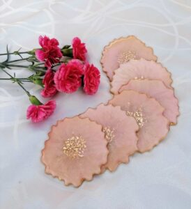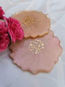 Podkładki w kolorze pastelowo perłowym różu z płatkami złota-szlagmetalu.Ten subtelny przedmiot może zachwycić każdego gościa,a praktyczne zastosowanie ochroni blat twojego stołu.