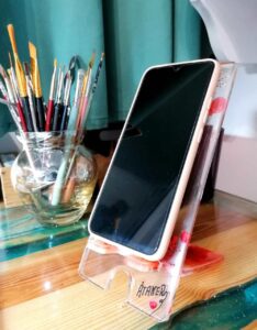 Podstawka wykonana z żywicy epoksydowej, w której zatopiono plastry drzewa orzechowego. Niesłychanie ułatwia obsługę i korzystanie ze smartfonu .
