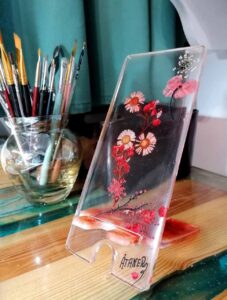 Podstawka wykonana z żywicy epoksydowej, w której zatopiono suszone naturalnie, prasowane rośliny.