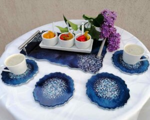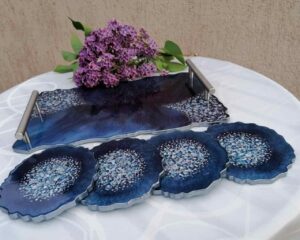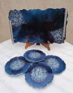 4 podkładki + tacka z żywicy epoksydowej w kolorze melnaż perły, różnych odcieni niebieskiego i ozdobiony płatkami srebra.